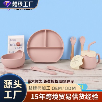 新品儿童硅胶餐盘7件套装婴儿分隔餐盘喂养围兜水杯叉勺辅食餐具