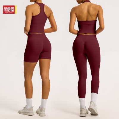 无缝美背瑜伽套装跑步速干紧身运动健身套装瑜伽服套装女 瑜伽健身服