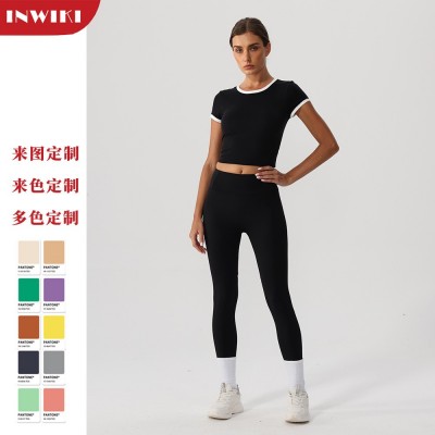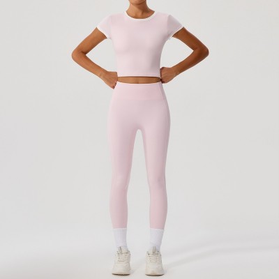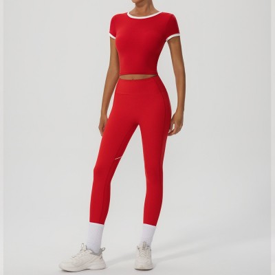 撞色瑜伽短袖上衣长裤套装高弹速干健身服套装女