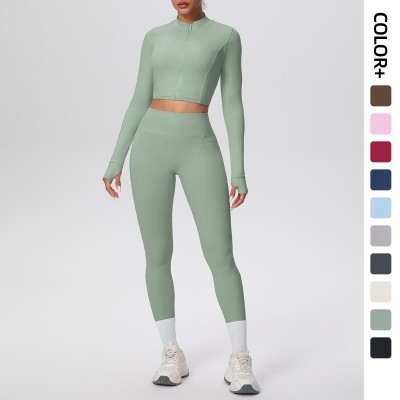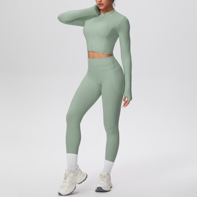 露脐外穿拉链外套瑜伽服高腰提臀口袋长裤运动套装休闲跑步健身服