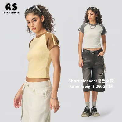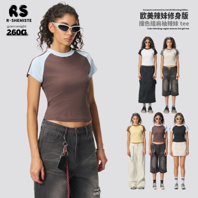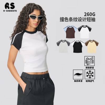 RS女装|跨境修身弹力辣妹t恤美式街头复古撞色条纹插肩短袖t恤女