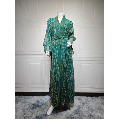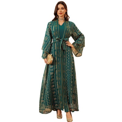 AB445 跨境中东穆斯林长袍网纱刺绣迪拜沙特连衣裙优雅两件套长袍