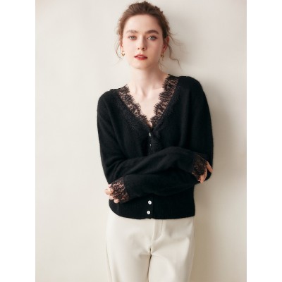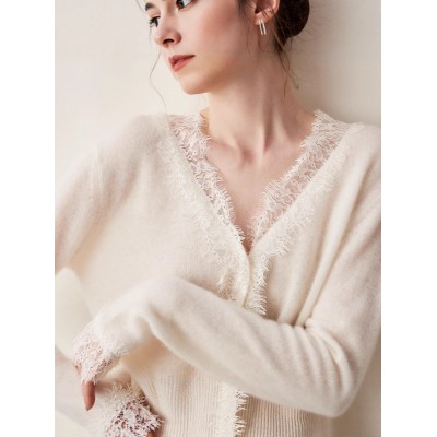 蕾丝花边山羊绒开衫女V领短款毛衣外套针织羊毛开衫长袖秋冬新款