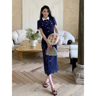 首页 > 男装 / 女装 / 内衣 > 女装 > 蕾丝/雪纺衫 > 新款女装深蓝色蕾丝花边拼接复古小香风撞色翻领短袖长裙连衣裙子